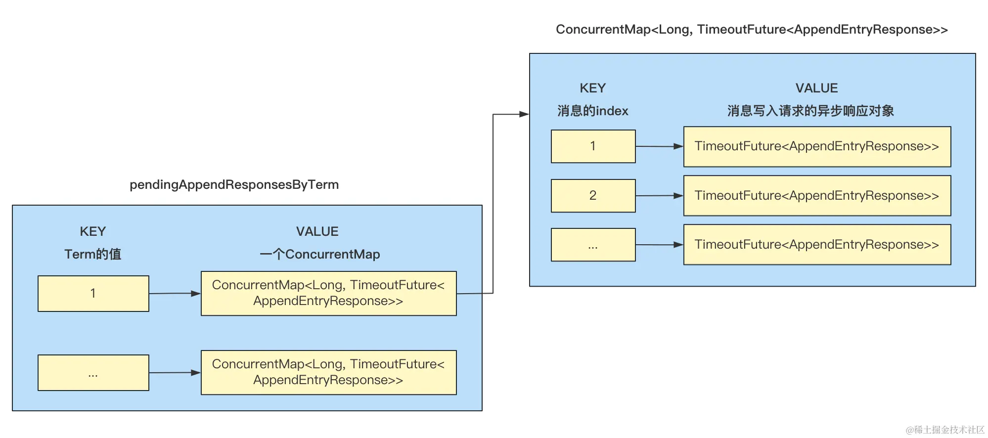 - pendingAppendResponsesByTerm:key为Term的值,value是一个ConcurrentHashMap,这个ConcurrentHashMap中的KEY为消息的index(每条消息的编号,从0开始,后面会提到),ConcurrentMap的KEY为消息的index,value为此条消息转发给Follower节点的异步响应对象AppendEntryResponse: