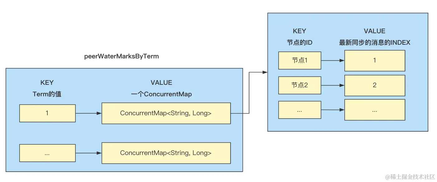 peerWaterMarksByTerm:记录了每个Follower节点的消息复制进度,KEY为当前的Term值,VALUE是一个ConcurrentMap,ConcurrentMap中的KEY为Follower节点的ID(peerId),VALUE为该节点已经同步完毕的最新的那条消息的index;