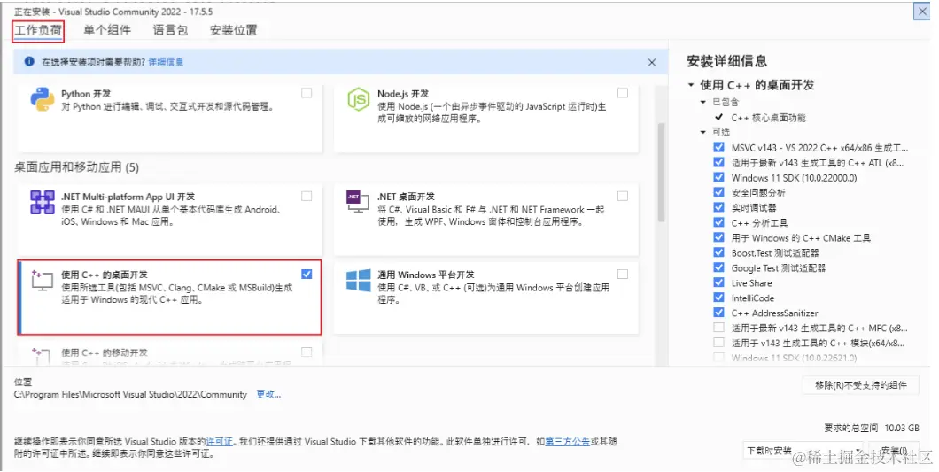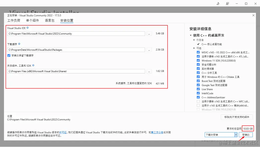 C++的桌面开发” 选项即可。 - 操作二:“安装位置” 中修改安装路径。