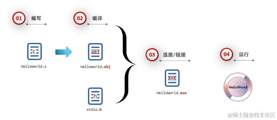 完成的C语言运行,分为以下4步,在VS中我们直接运行,其实是把中间的步骤给省略了