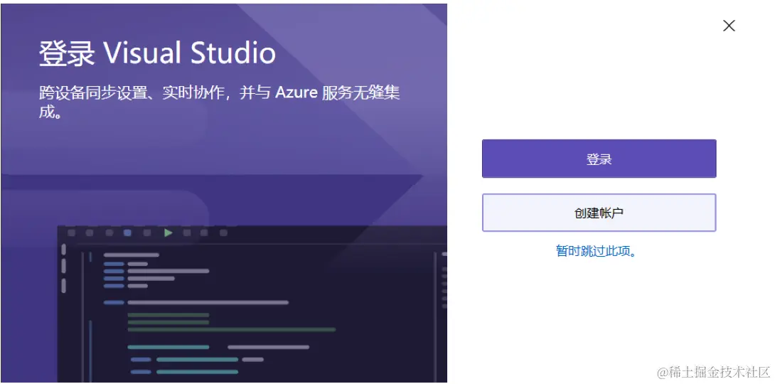 - 接下来,VS希望你使用微软的账号登录,没有可以注册一个。也可以点击“暂时跳过此项”。
