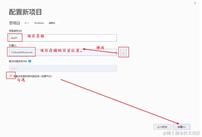 - 指定项目名称。确保位置下的项目存储目录存在。 勾选 “将解决方案和项目.....” ,点击 “创建”。