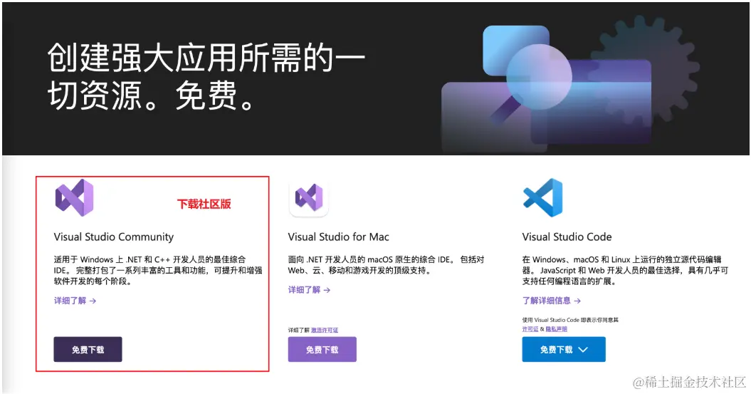 https://visualstudio.microsoft.com/,下载Visual Studio安装包。