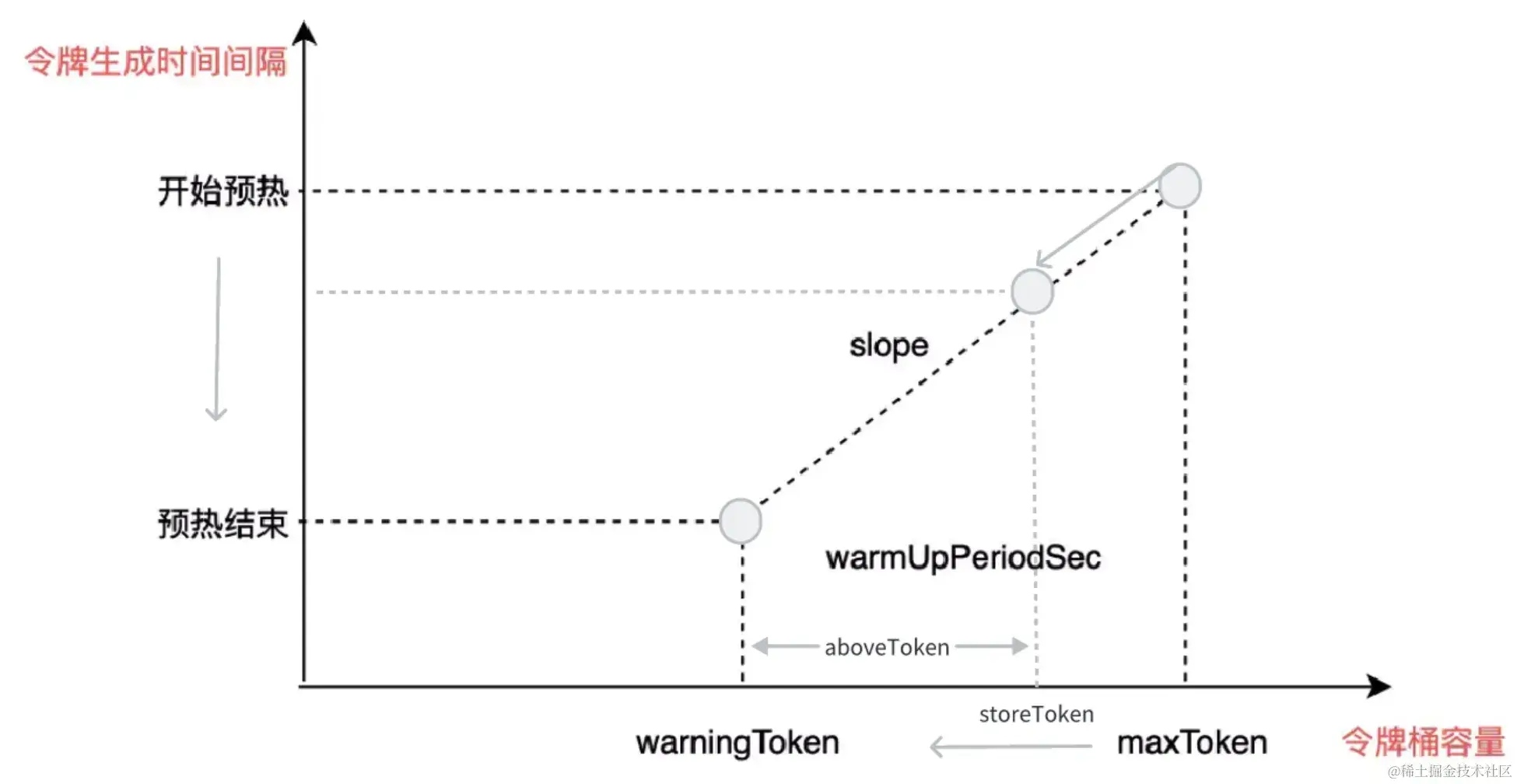 maxToken:代表令牌桶的最大容量,在预热启动时,storeToken的值为maxToken。