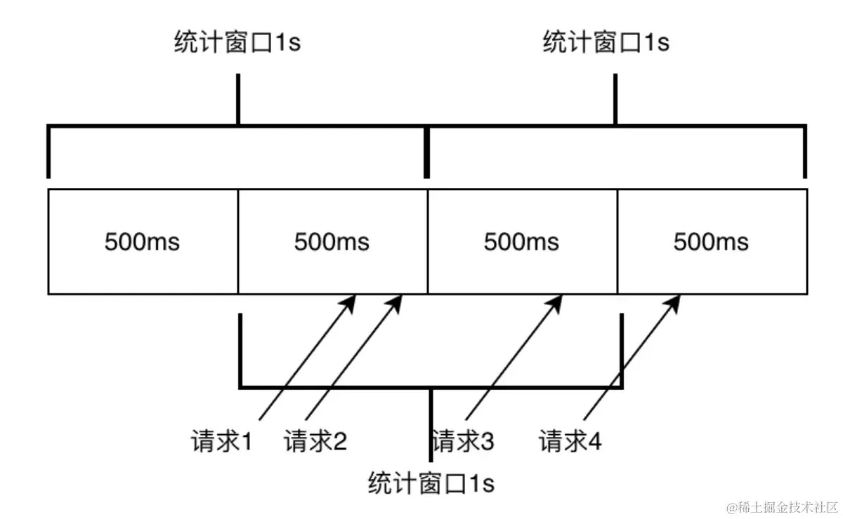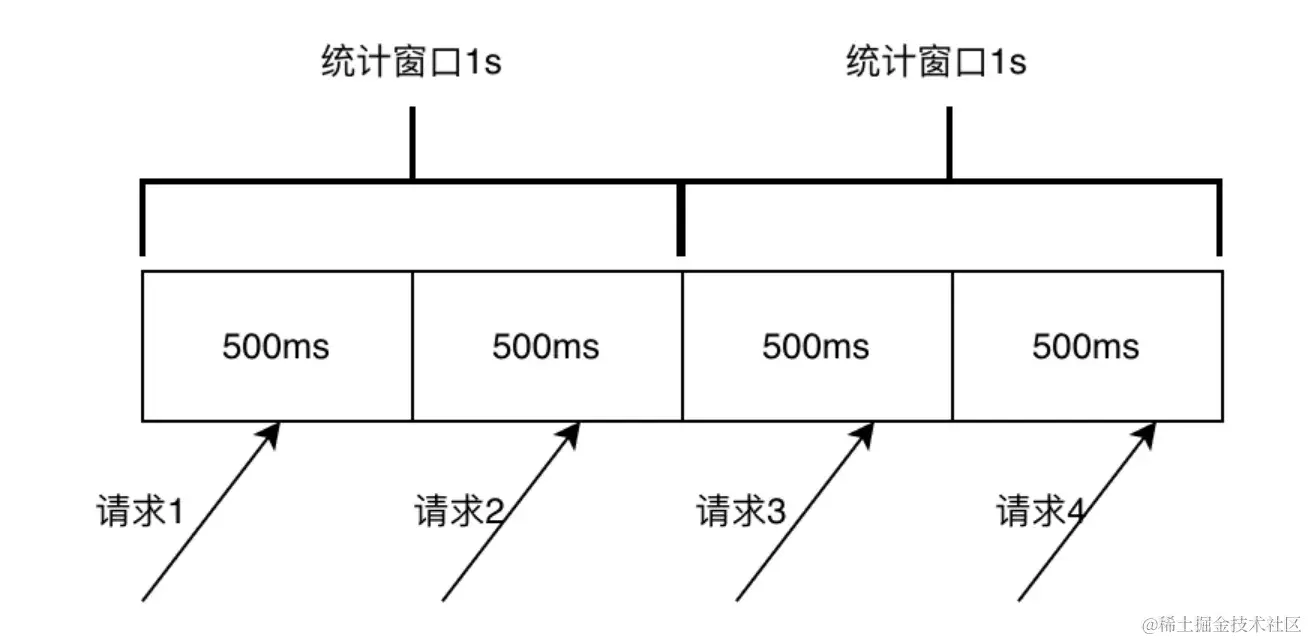 这种统计方式简单易懂,实现简单,但是在流量不均匀的情况下容易出现突发流量问题,导致限流不准确。如下图所示,假设限流设置为1秒内通过qps数为2,由于在1s的时候统计窗口清零,对于500ms-1000ms这个区间内通过的2条请求没有记忆,1000ms-1500ms这个区间内的请求能正常通过,但实际上在500ms-1500ms这个区间的请求数已经是3了,超过设定的2的限流值,在极限情况下,固定窗口的真实流量可能达到限流值的2倍。