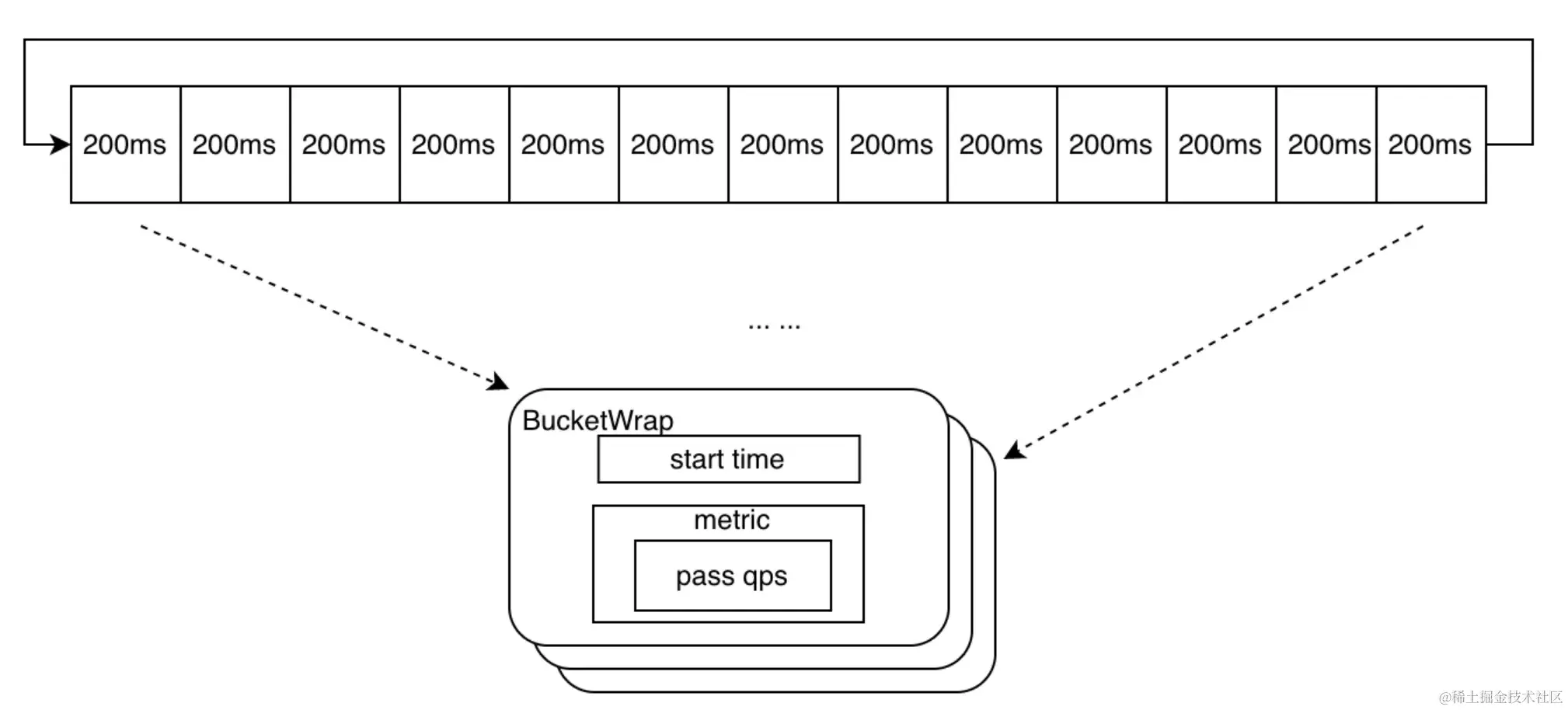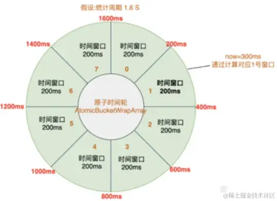 同时,一个统计周期是由多个小窗口顺序组合而成,设计上为了避免内存空间使用上的浪费,采用原子时间轮的方式来将小窗口进行收尾相连,以循环队列的方式进行编排,数据结构是AtomicBucketWrapArray,示意图如下。