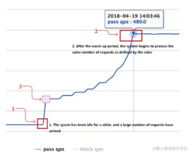 然而,固定阈值的方式存在一个问题,即在流量突增的情况下,通过的请求数会一瞬间达到阈值,容易对下游系统造成较大压力,简单来说,过刚易折,因此,另一种提前预热的策略应运而生。