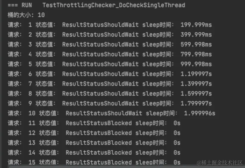 漏桶单元测试:设定桶的允许的时间间隔是2s,每个请求的排队时间200ms,15个请求进入之后的每个请求的状态值与等待触发执行的时间如下所示: