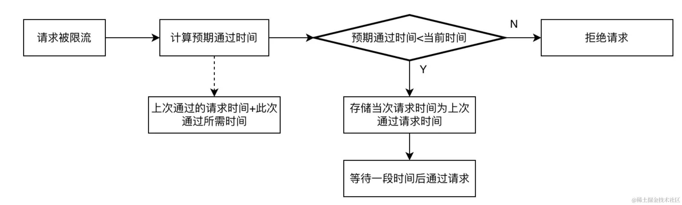这种token计算策略比较简单,它的意思是在一个统计周期内允许通过的请求数是固定的。只需要比较统计周期内统计的通过请求数和阈值,就能判断当前请求是否需要被限流。