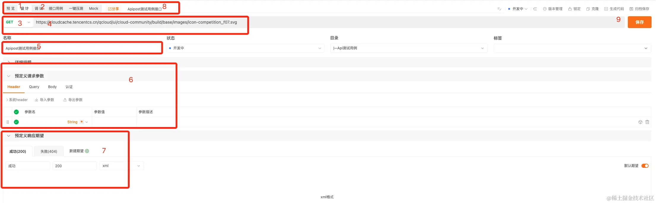- 自定义响应参数:分为请求头、响应头、Cookies、成功示例、失败示例等≠