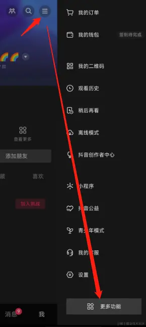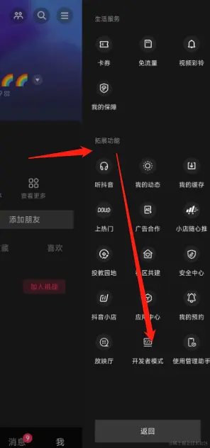 2、此时你的抖音就能打开开发者模式了,个人页右上角“三”->更多功能->拓展功能->开发者模式
