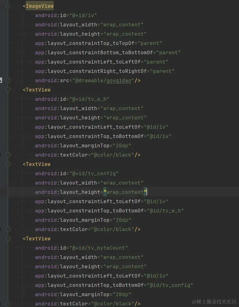 在XML里加载图片资源,并且在代码中获取bitmap相关的信息显示出来,布局和代码如下: