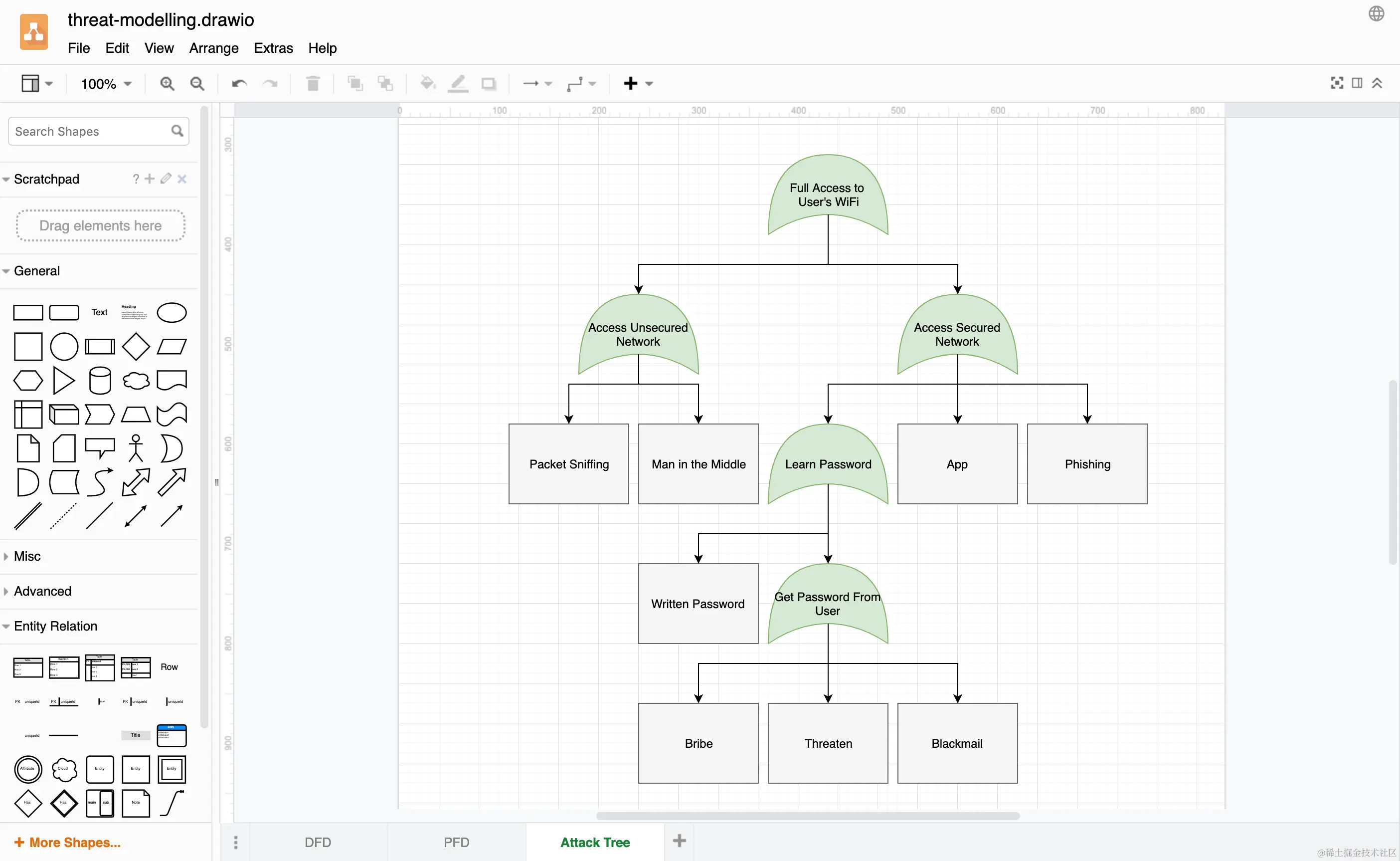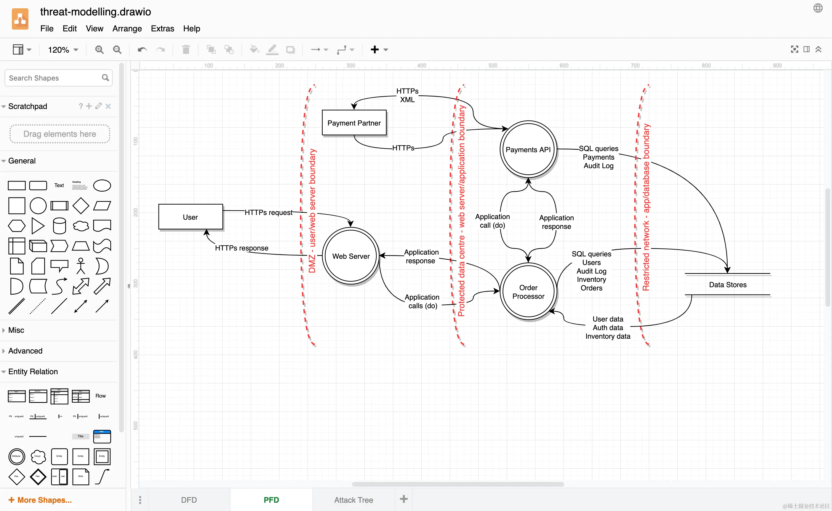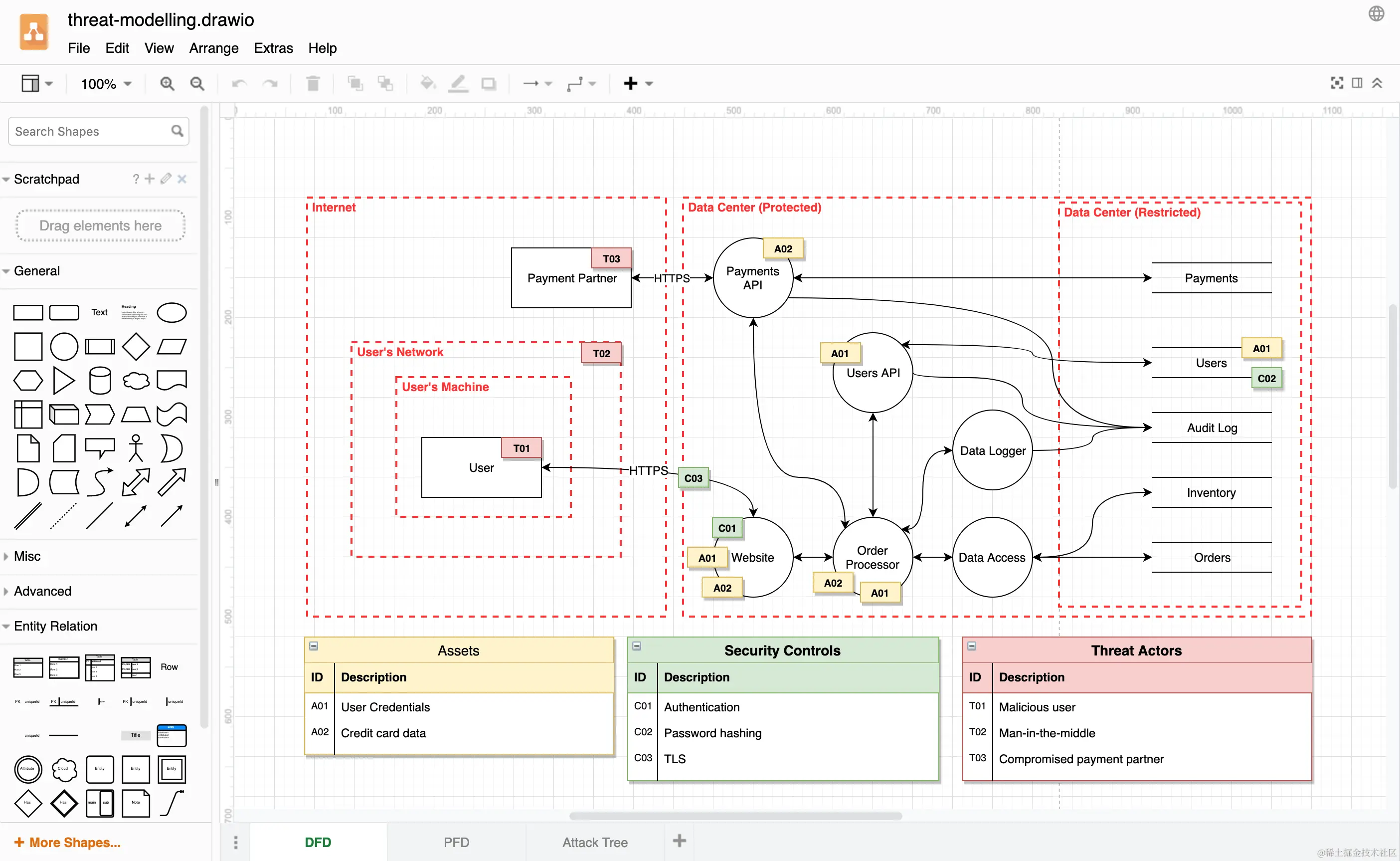 由于你的威胁建模图包含有关你的应用程序和基础设施的高度敏感数据,因此请确保它们是安全的并使用该图。drawio桌面应用程序,可用于Windows, macOS和Linux的版本。