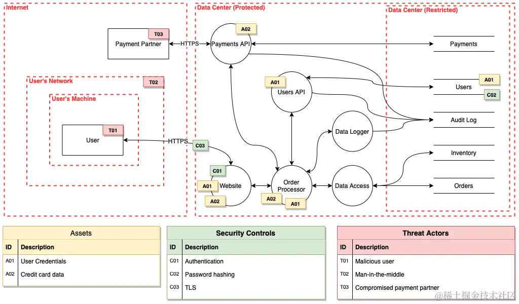 威胁建模DFDs与系统工程师使用的DFD类似,但有一些额外的图形。运营或基础设施威胁模型(OTMs)是一种特定类型的数据流程图,用于可视化独立、分组和共享组件如何通过连接路径相互通信并与外部实体通信。
