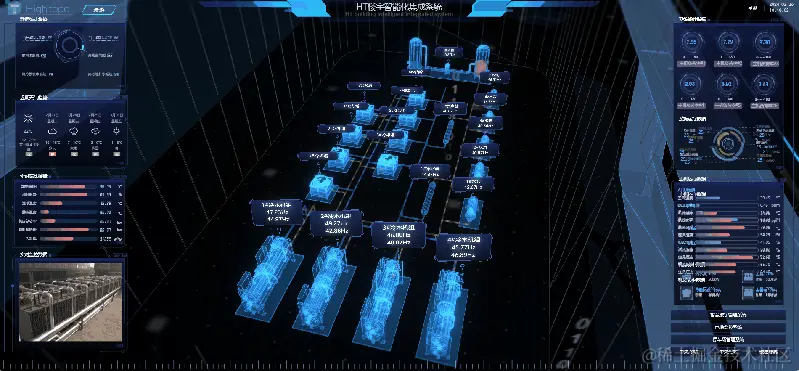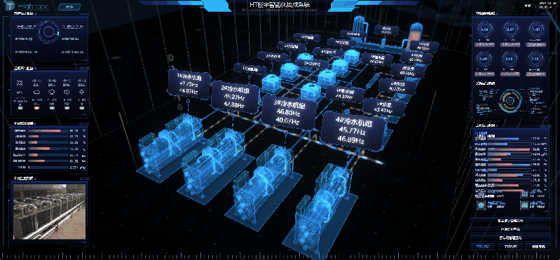 中央空调冷站为公共建筑提供空调冷冻水,一般由冷机、冷冻泵、冷却泵、冷却塔、阀门、自动控制系统等组成。图扑应用自研 HT 引擎强大的渲染功能,真实还原各设备的模型及运作工况。帮助用户实现自动管理和控制,提高运行效率,降低成本投入。