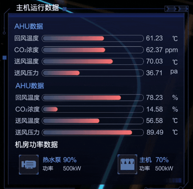 设备的良好运行,需要定期维保和实时监测。图扑 HT 运用图形化的手段将机房功率、主机负荷率、系统运行数据、瞬时制热量、热水温差、 AHU 数据信息进行解读和传达,帮助用户发现其中的规律和特征,挖掘数据背后的价值。