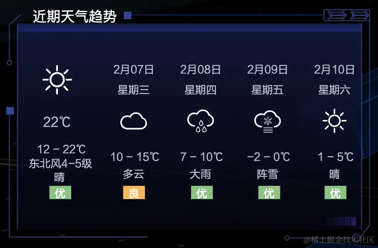 将气象数据接入图扑可视化系统,展示未来一周天气状况,可同步给园区业主,提醒带好雨具、做好衣物增减,或在自然灾害来临前采取防范措施。图扑 HT 拥有丰富的可视化图表组件,选用动态图表实时监测室外温度、相对湿度、露点温度的实时数据,维护室外设备作业安全。