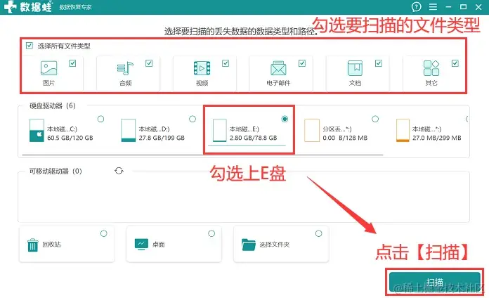 步骤2:将需要扫描的文件类型都勾选上,并且勾选上【本地磁盘:E盘】,单击 【扫描】 ;