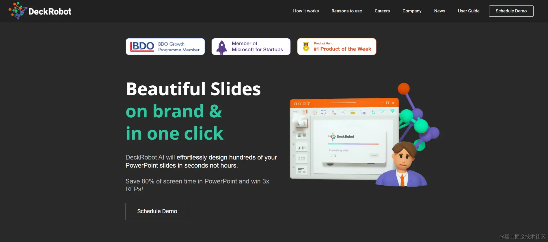 DeckRobot 是一个方便的 AI 插件,可以在几秒钟内将你的草稿变成精美的 PPT 演示文稿。它可以确保你的最终套牌符合你的公司品牌指南,以便你在创建的所有内容中保持一致的品牌。这是减少手动设计时间的好方法,并且所有数据都安全地保存在服务器上。