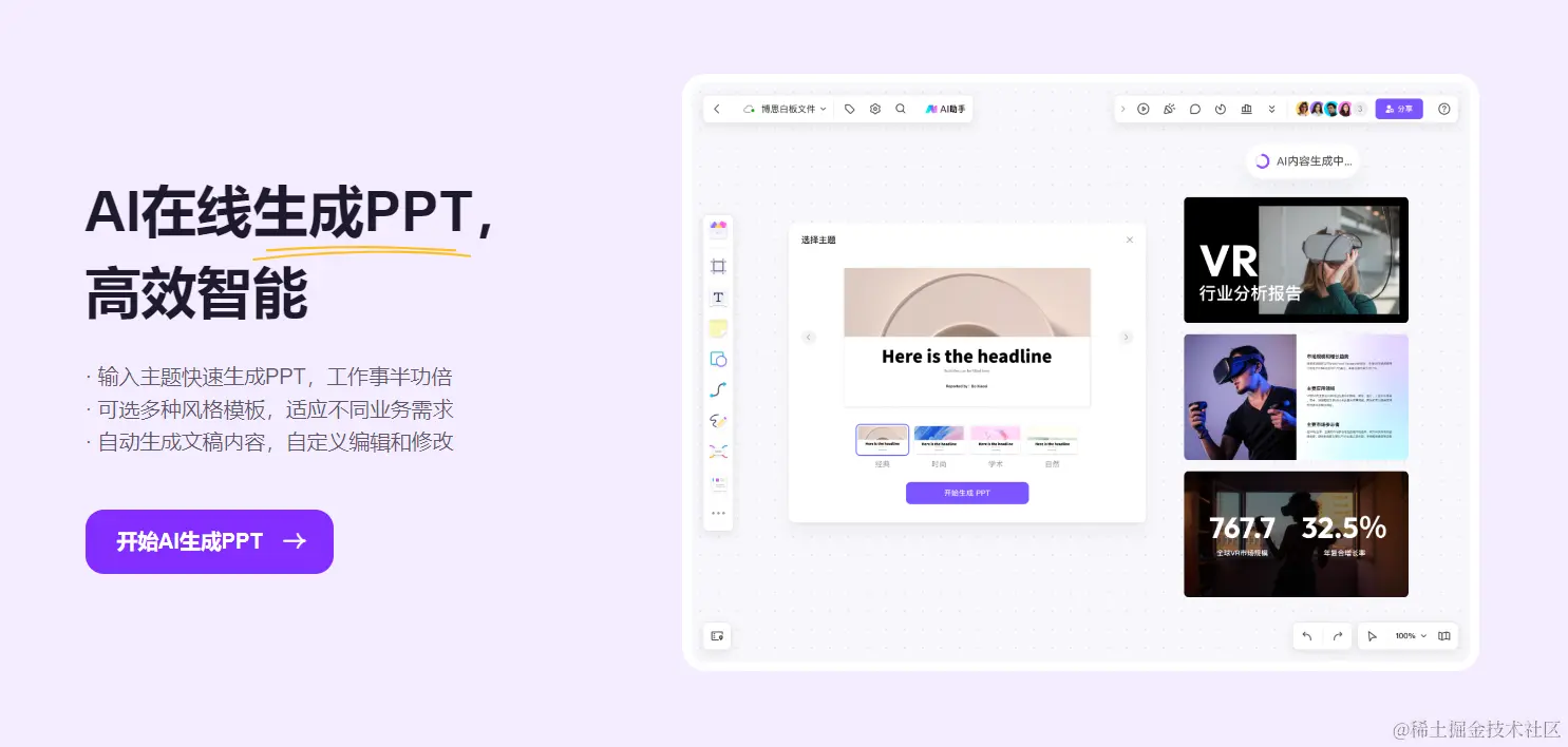 就这里说到的 ai 做 ppt 的软件,它们可以将复杂的设计和排版过程简化,删繁就简,只需要输入 PPT 主题或大纲,就能快速生成专业级别的 PPT。这样的神器,无疑是办公室里必不可少的工具。如果你日常总为制作 PPT 而烦恼,或是苦于在 PPT 上花费大量的时间,那就千万不要错过下面这些 AI 做 PPT 的软件!
