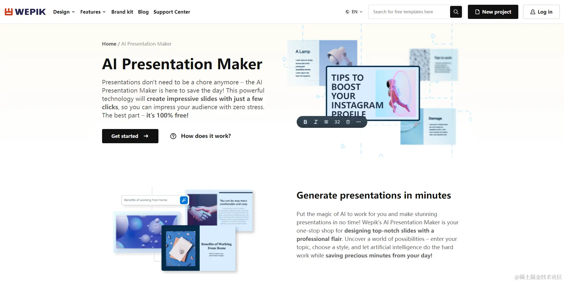 Wepik 是一款多功能图形设计编辑器,为用户提供大量预制模板和生成式 AI 工具,以满足各种设计需求。WepikPresentationMaker 是包含在 Wepik 中的产品之一,它利用人工智能和创建工具来简化起草演示文稿和定制演示材料的过程。