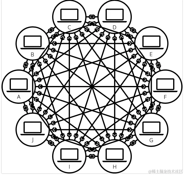 当有更多计算机加入的时候,情况就变得复杂了,可能会形成下面这样网线满天飞。