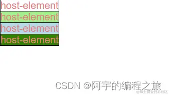 除了使用:host伪类外,:host还提供了selector的选择器使用方式,用于过滤某个条件下的宿主标签,比如我们选择属性为isHost的标签、class为isHost的标签以及id为isHost的标签并分别设置不同的样式进行区分