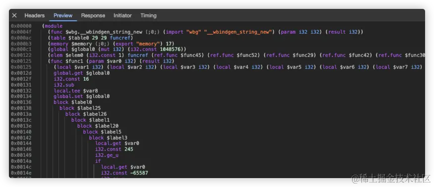 如果你尝试去打印一个 wasm 暴露出来的方法,将会看到 [native code] ,wasm 直接暴露的方法被认为是原生的方法,不会打印原始代码。毕竟原始代码也不是 js 写的。如果尝试在控制直接查看 wasm 文件的内容,看到是下面的内容,一般人肯定是看不懂的