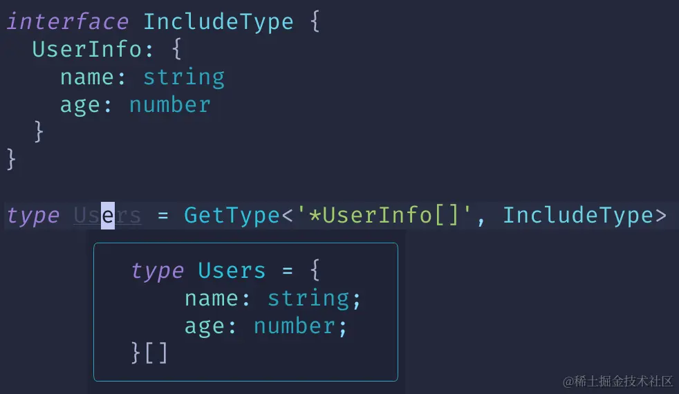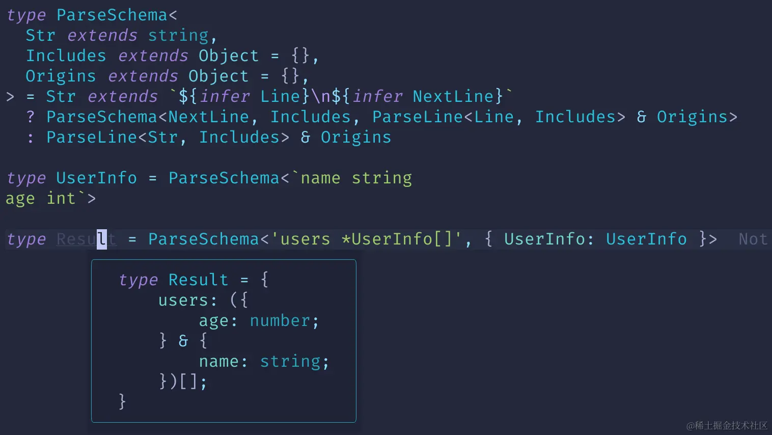 我们接着往下玩,如果是个数组类型应该怎么在字符串里声明呢?这时候我们可以往上加一层,定义一个用来解析类型声明的泛型GetType,然后递归来转换复杂的字符串schema内容。