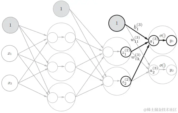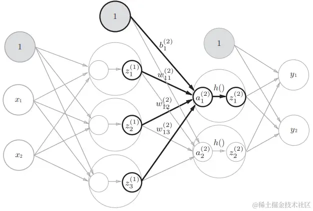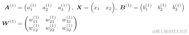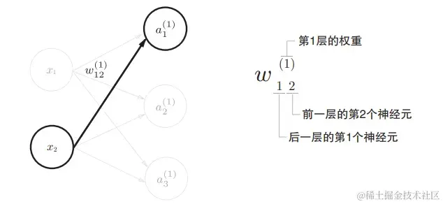 权重和隐藏层的神经元的右上角有一个“(1)”,它表示权重和神经元的层号。权重的右下角有两个数字,它们是后一层的神经元和前一层的神经元的索引号