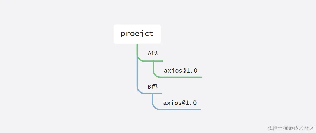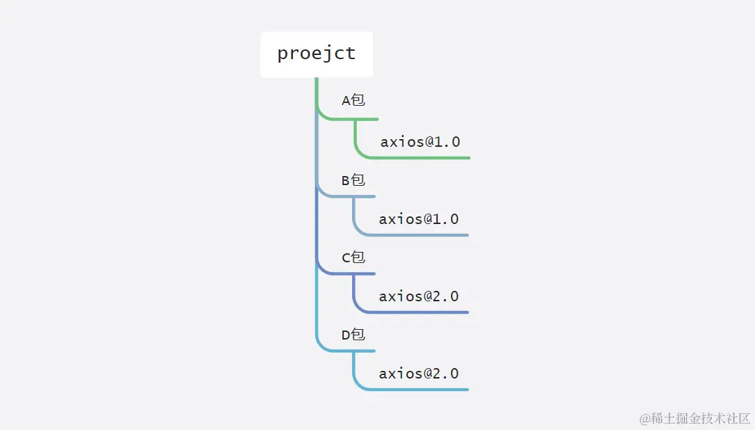 不足: 如果A包和B包都依赖了axios,就会导致axios在A包和B包的node_modules中各安装一次,产生重复安装。