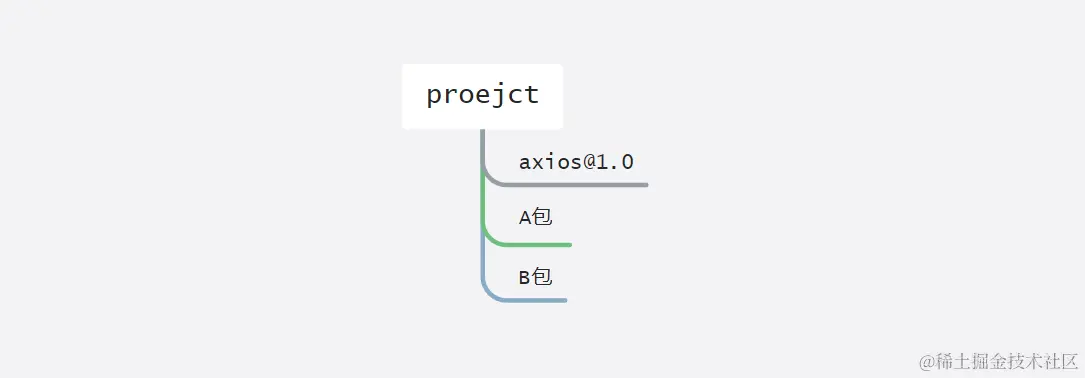 如果对上图应用flat模式,我们会遇到一个问题: 当npm遍历A包和B包,发现公共依赖axios@1.0,决定将axios@1.0提升到项目根目录的node_modules中。