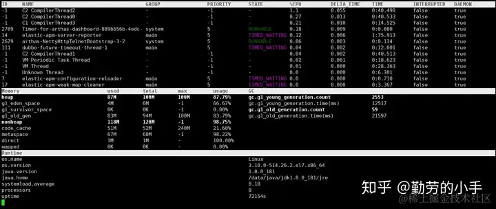 在控制台输入dashboard 回车后会看到下图对应的信息,这里主要展示了当前监控的进程信息、包括 实时的线程信息、内存分配和使用状态信息、系统环境信息。