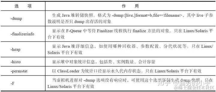 使用场景: 监控堆内存使用情况和对象占用情况, 生成堆内存快照文件,查看堆内存区域配置信息。