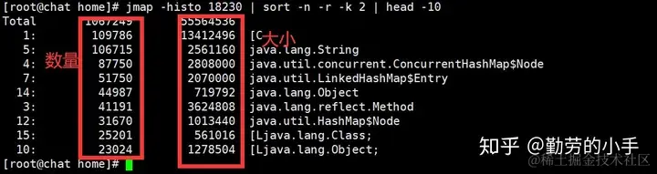 jmap -histo 18230 | sort -n -r -k 3 | head -10 //统计合计容量前十的类有哪些