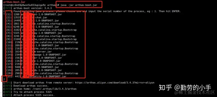 athas启动成功后会打印出来当前服务器的所有java进程,然后以编号的形式排列出来,在控制台输入你想要监控的应用编号即可进入arthas的监控控制台,这里我选择了编号为7的应用进行监控。