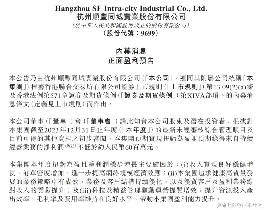 (图源:顺丰同城2023年正面盈利预告)