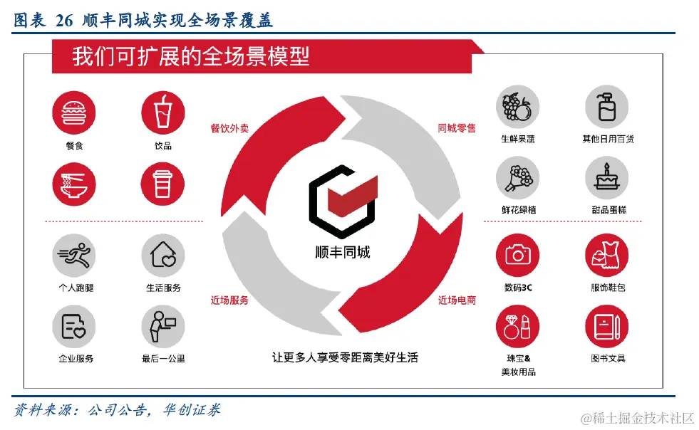 **业务结构方面的变化最为关键。**华创证券在一份研报中指出,即配行业从餐饮外卖场景快速向同城零售、近场电商、近场服务等多元非餐场景渗透,拉升了行业天花板。而在这个过程中,顺丰同城确立了多个场景中的长期优势。