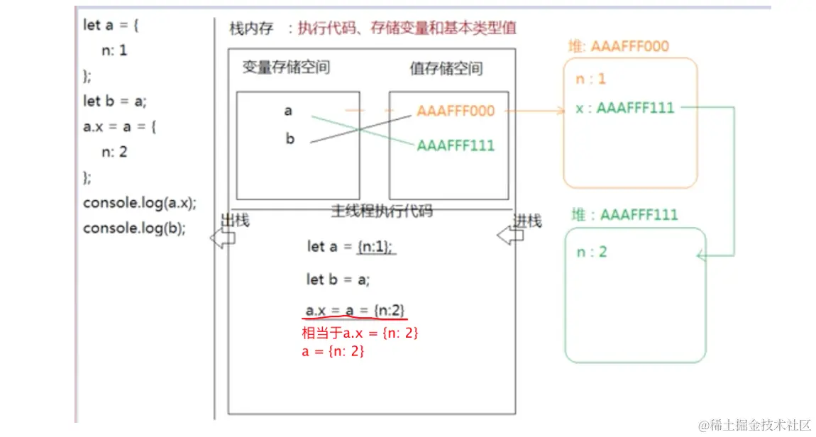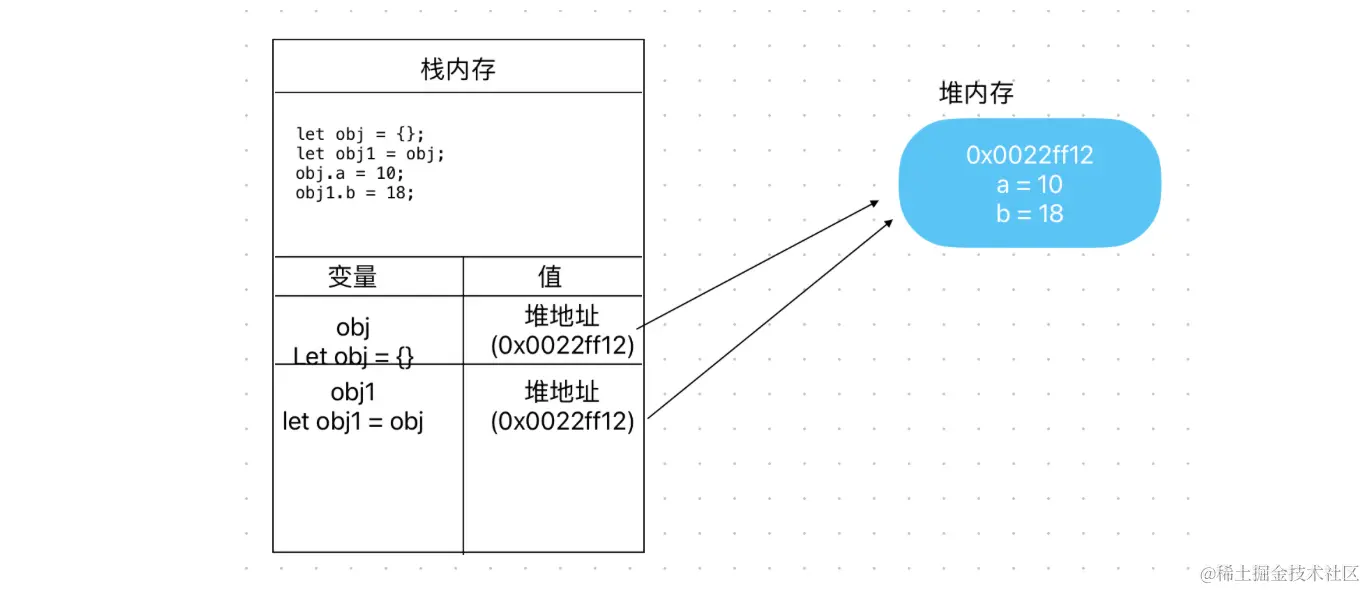 - 引用数据类型存储在堆内存中,存储的是内存指针,多个引用会指向同一个地址