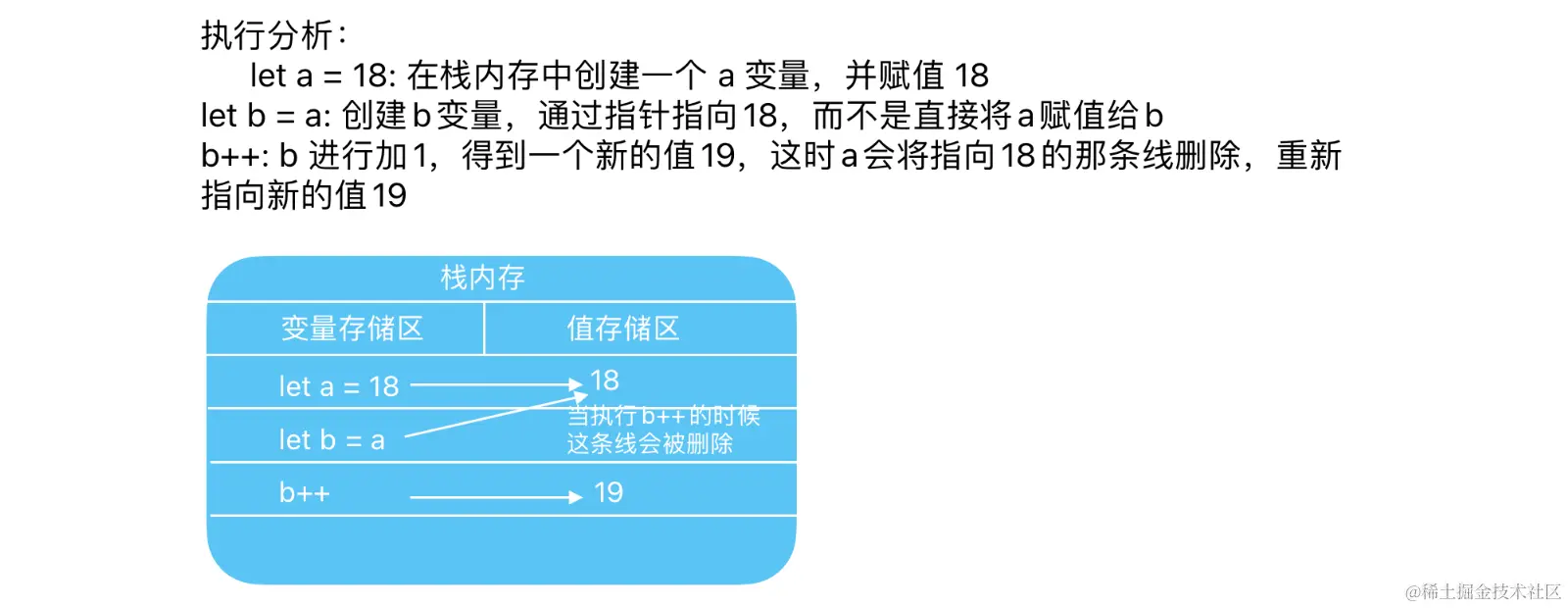 以上代码可以看出,a中保存了值是18,当使用a的值初始化b的时候,b中也保存了值是18,但是b中的18和a中的18完全是独立的,b中的值只是a中值的一个副本,所以这两个变量之间互不影响,其关系图如下