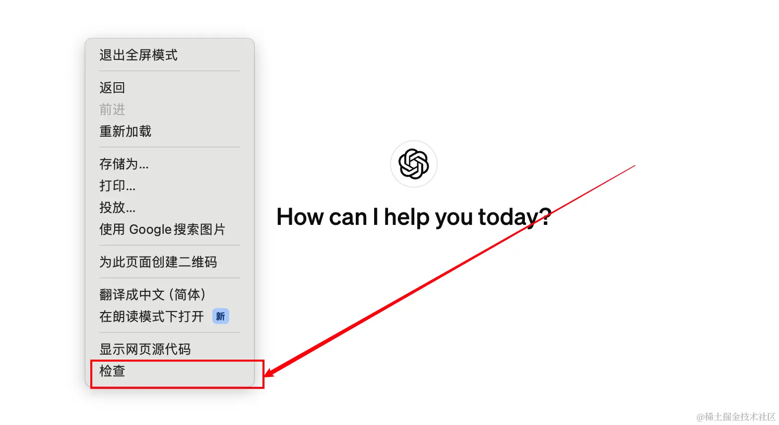 在ChatGPT对话页面,鼠标右键,然后选择最下方的检查