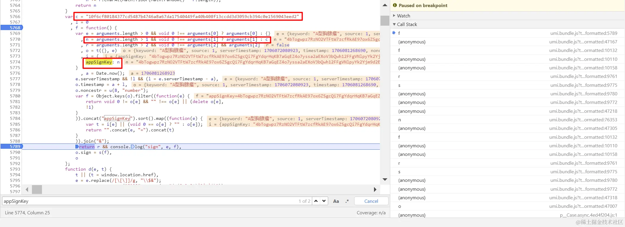 大概跟了几个栈找到了sign关键词,但是并不确定这个地方的sign参数是不是我们发包的那个sign参数,打下断点盲测一下。