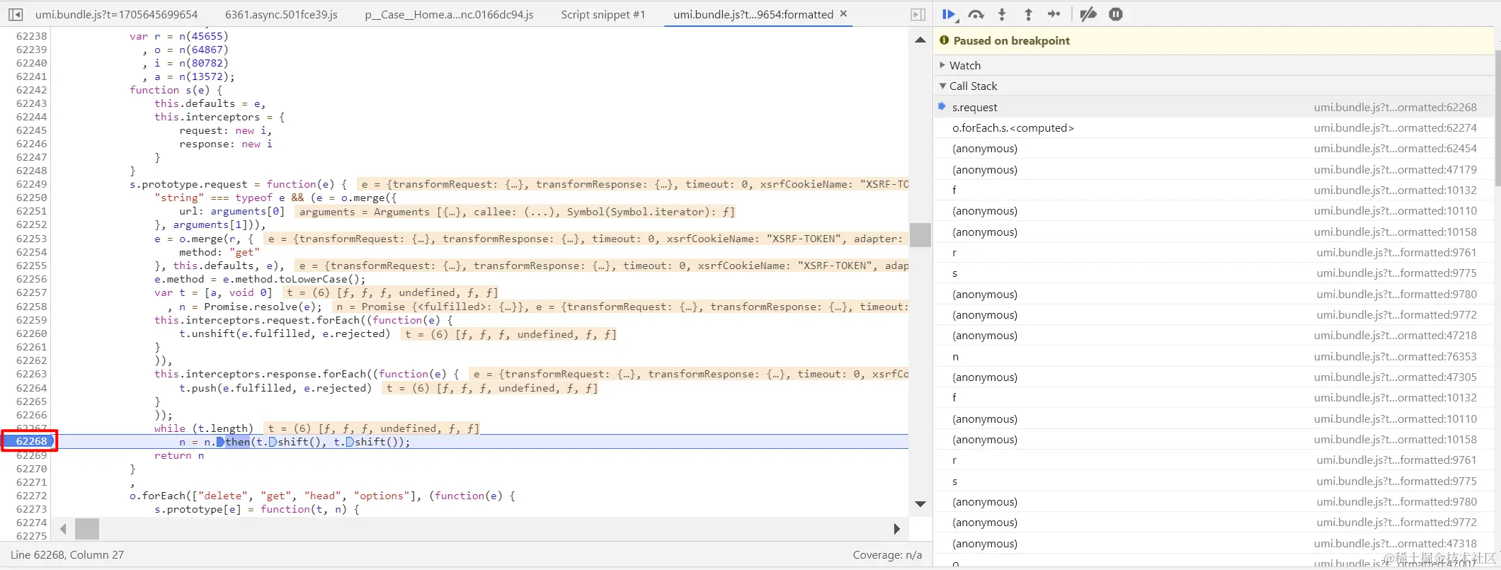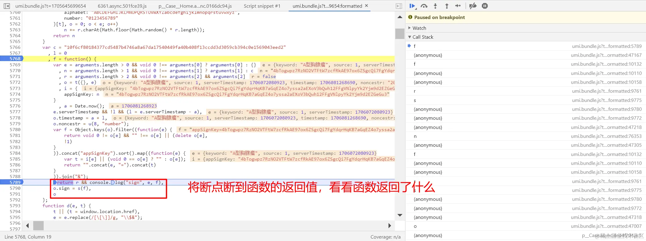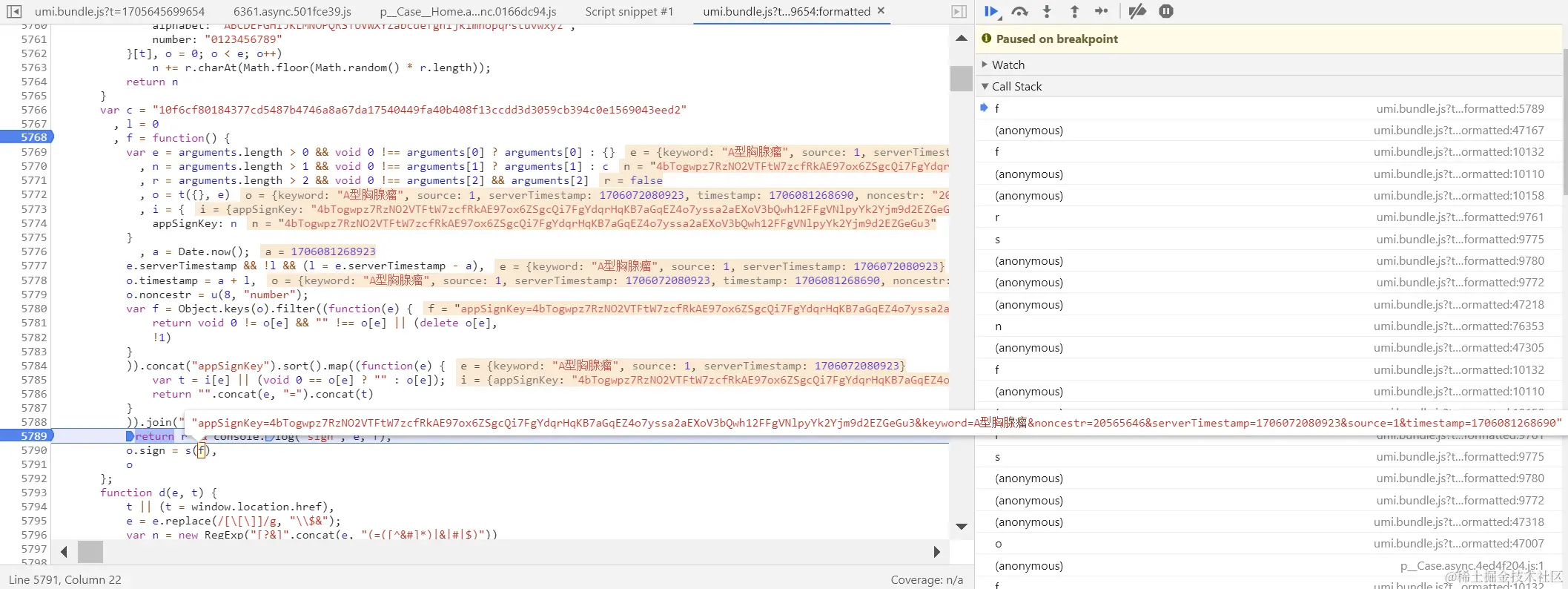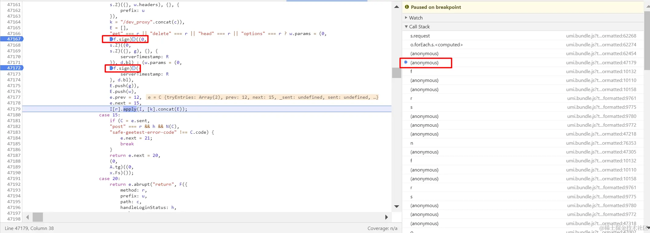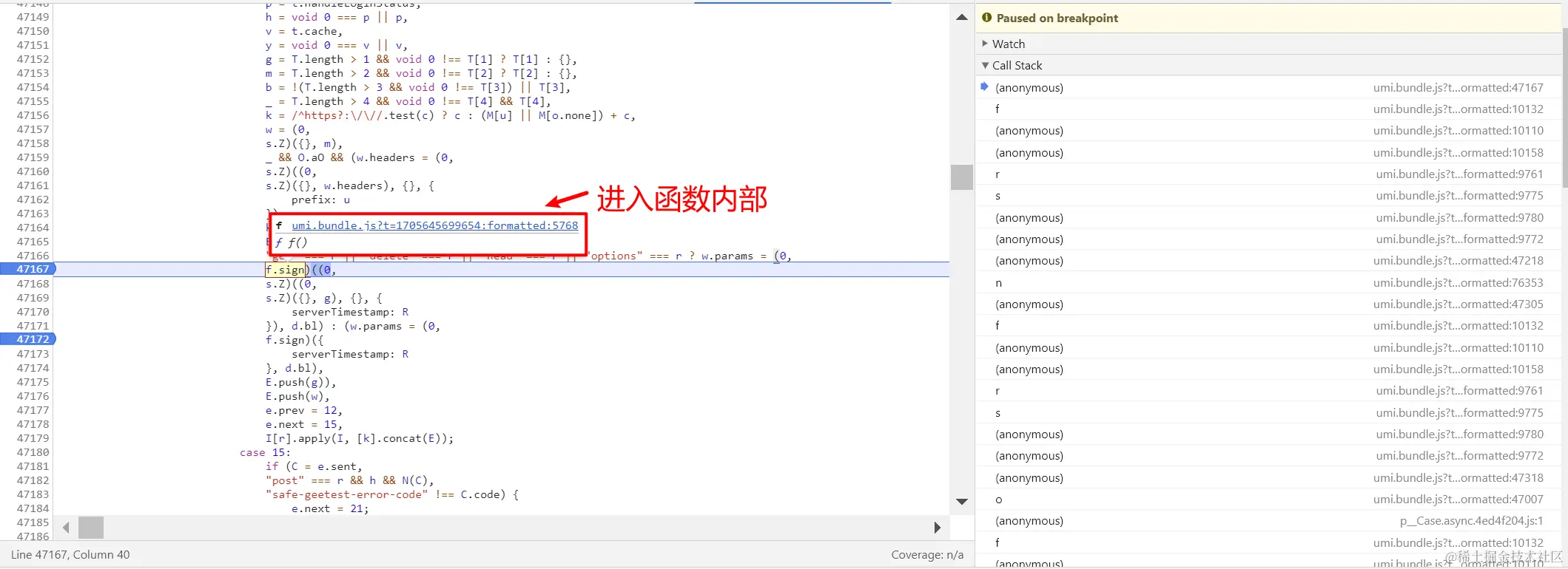 再次发包的时候,断点断住了。这个sign参数是一个f对象的一个函数,并不是一个sign参数值。而我们想要找到的是sign参数值,经过猜测,这个断点能够在携带sign参数的那个发包时断住,就肯定与sign参数有关。直接进入函数内部查看。