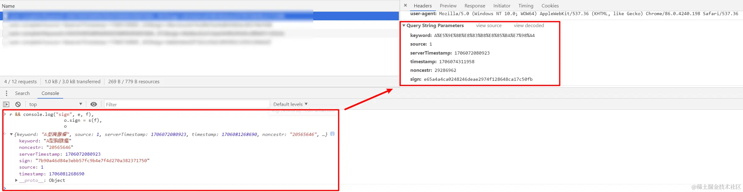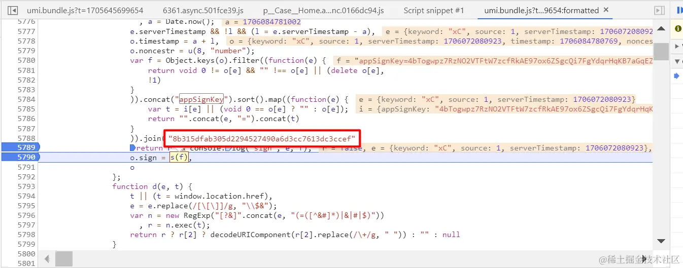可以看出sign参数是appSignKey,keyword,noncestr,serverTimestamp,source,timestamp拼接之后传进了s函数生成的。除了appSignKey是代码生成的,其余都是发包里面携带的明文。