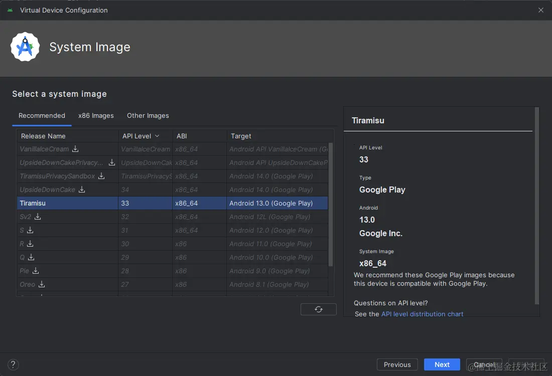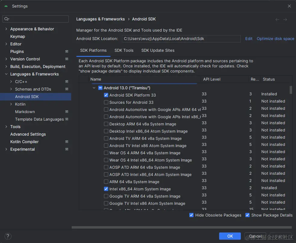 Android 13 (Tiramisu)选项,确保勾选了下面这些组件:(参考下面第一张图片)Android SDK Platform 33Intel x86 Atom_64 System Image(官方模拟器镜像文件,使用非官方模拟器不需要安装此组件)