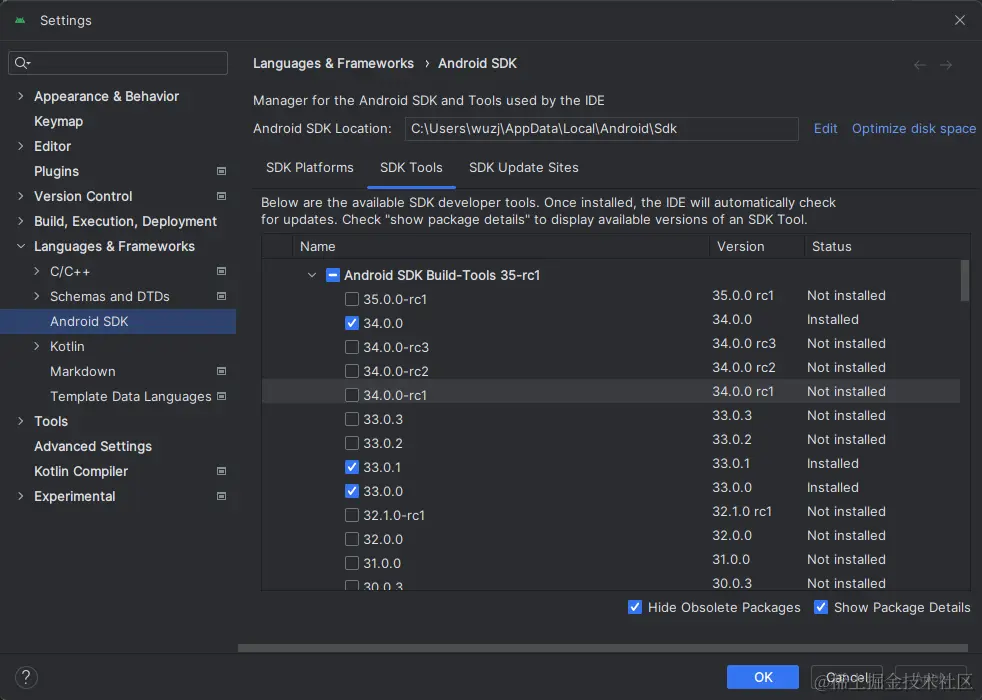 然后点击"SDK Tools"选项卡,同样勾中右下角的"Show Package Details"。展开"Android SDK Build-Tools"选项,确保选中了 React Native 所必须的