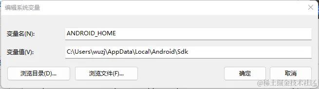 控制面板 -> 系统和安全 -> 系统 -> 高级系统设置 -> 高级 -> 环境变量 -> 新建,输入变量名:ANDROID_HOME,变量值C:\Users\wuzj\AppData\Local\Android\Sdk(路径根据实际路径进行修改,可在上图SDK Manager中看到路径)