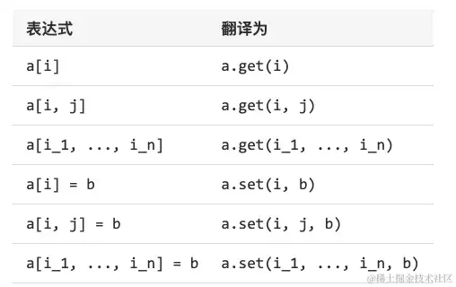 下表访问操作符:对于数组或者区间或者map:a[i],a[i,j]等,其操作符函数如下: