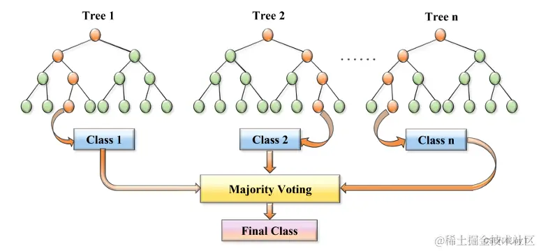 随机森林是一种集成学习方法,由多个决策树组成。每棵树都是独立地基于数据的随机子集进行训练的。