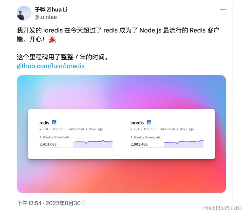 直到2022 年 8 月 30 日,历时整整7年,ioredis 成为了 Node.js 最流行的 Redis 客户端。
